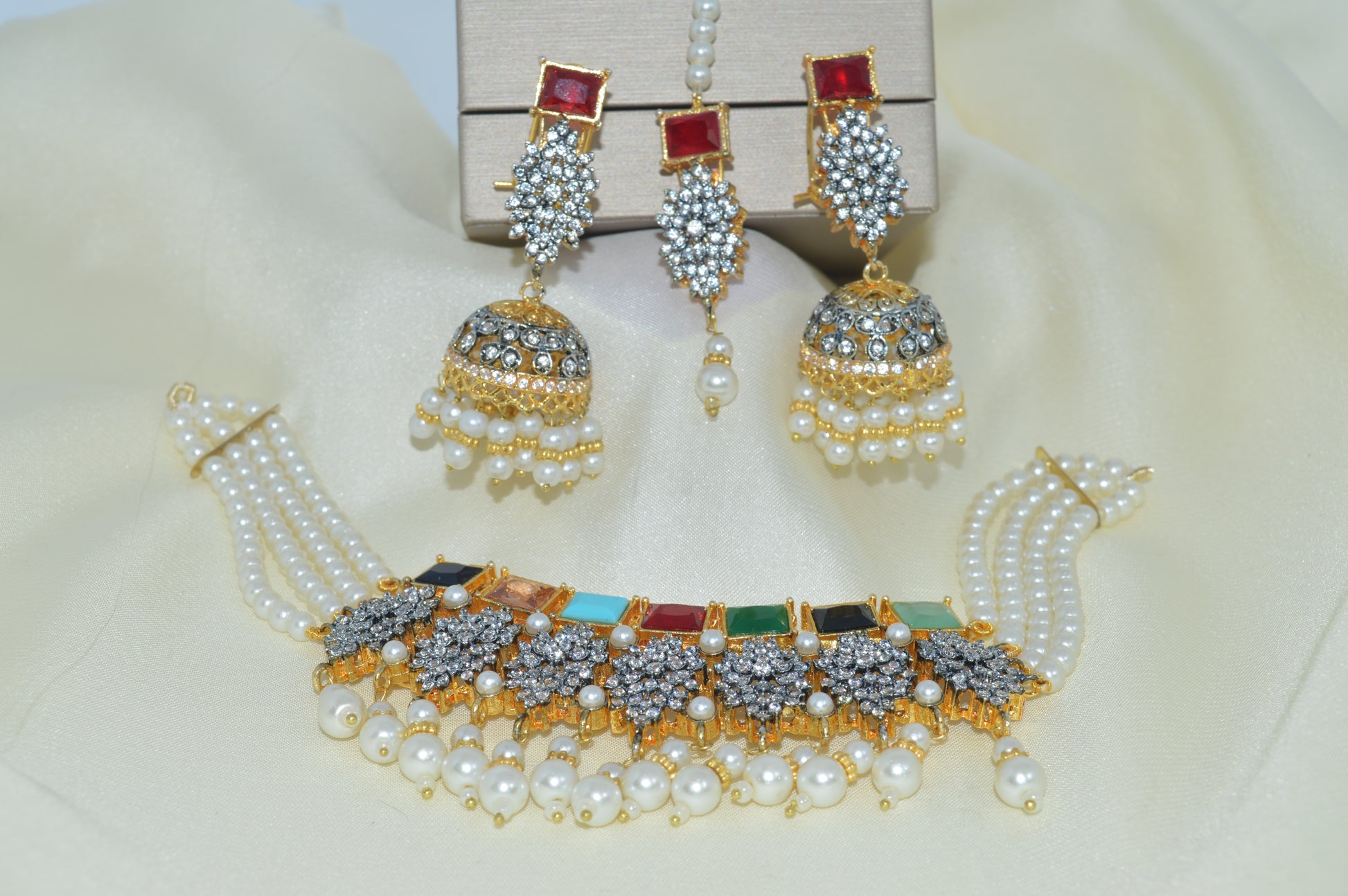 Enhance your bridal and festive look with this exquisite gold choker set, designed in a classic pearl mala style. Featuring high-quality pearls, intricate craftsmanship, and a luxurious gold finish, this set is perfect for weddings, receptions, and grand occasions. Available in two stunning variants – Black Pearl for a bold and regal look and Multicolor Stones for a vibrant and festive charm, both elegantly paired with a white pearl mala for a timeless appeal.
